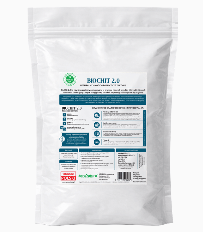 Biochit 2.0 to organiczny nawóz glebowy w formie peletu, zawierający chitynę oraz wysoką zawartość substancji organicznej (≥80%). Produkt wspiera aktywność biologiczną gleby, poprawia jej strukturę oraz dostarcza roślinom podstawowych składników pokarmowych: azotu, fosforu, potasu, wapnia i magnezu.